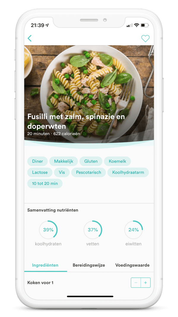 Elk recept wordt perfect afgestemd op jouw caloriebehoefte en macro’s. Daarna kun je zelfstandig aan de slag met de app en alles aanpassen waar nodig. Klinkt dat niet geweldig?